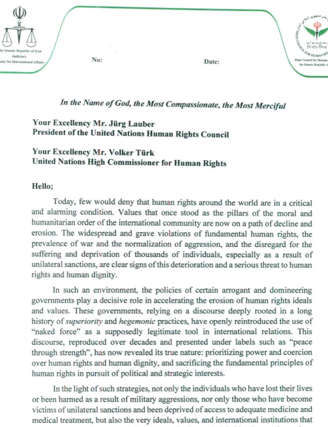 The letter of the Secretary of the Human Rights Headquarters to the President of the Human Rights Council and the High Commissioner for Human Rights
