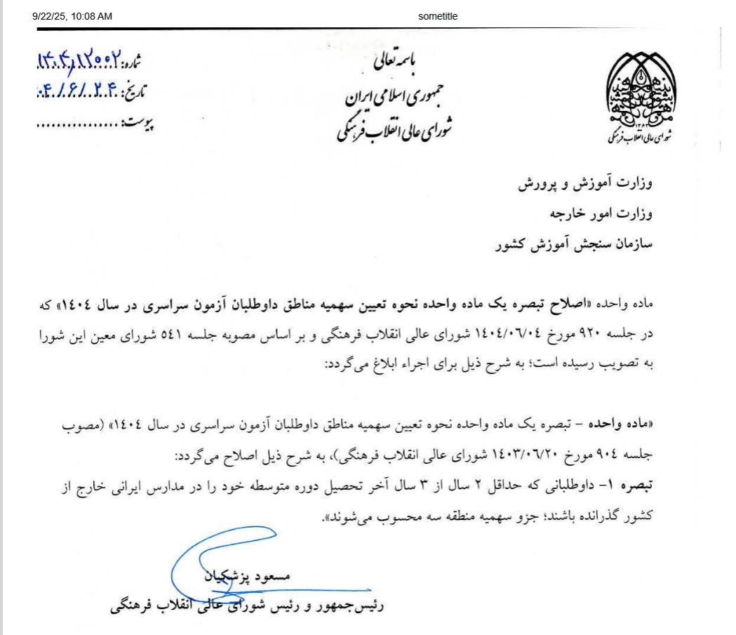 با مصوبه شورای عالی انقلاب فرهنگی، در خصوص تبصره ماده واحده تعیین سهمیه مناطق، داوطلبان مدارس خارج از کشور جز سهمیه منطقه سه محسوب میشوند.