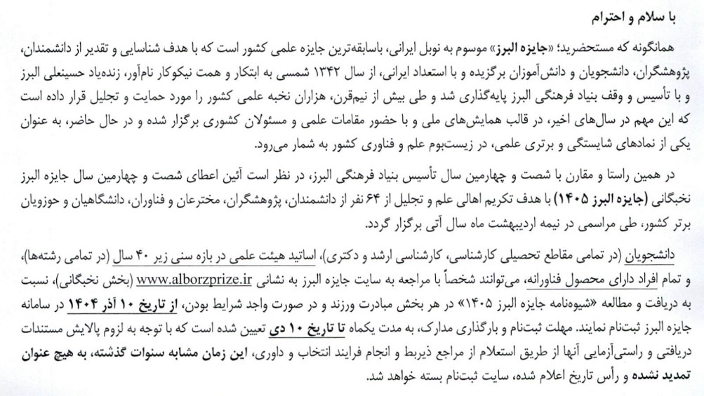 شایان ذکراست متقاضیان می‌توانند تا تاریخ 10 / 10 / 1404 نسبت به ثبت نام و بارگذاری مدارک اقدام نمایند.