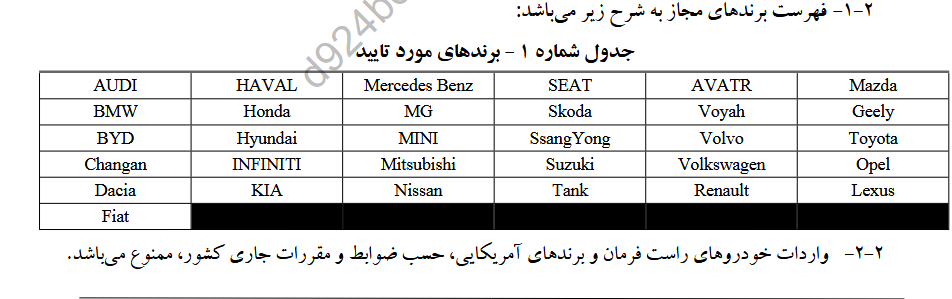 2.2- واردات خودروهای راست فرمان و ویژندهای آمریکایی ، حسب ضوابط و مقررات جاری کشور ، ممنوع میباشد ؛